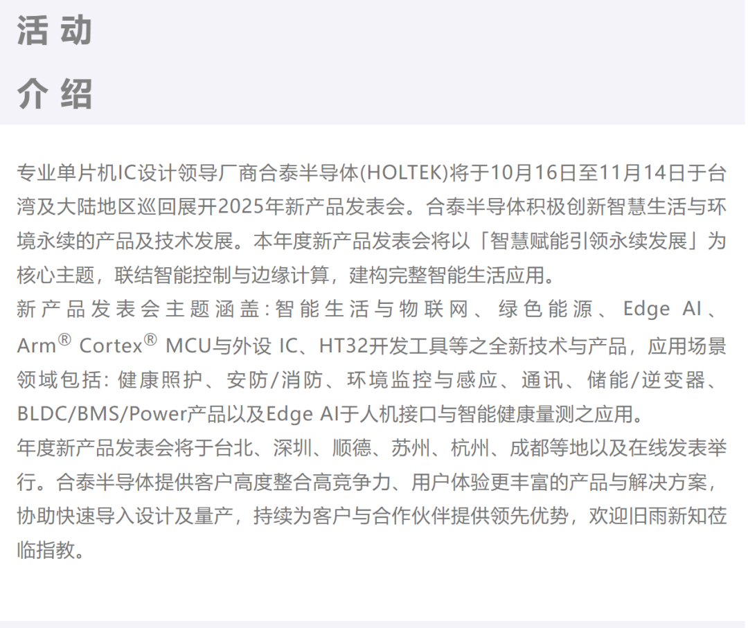 专业单片机IC设计领导厂商合泰半导体(HOLTEK)将于10月16日至11月14日于台湾及大陆地区巡回展开2025年新产品发表会。